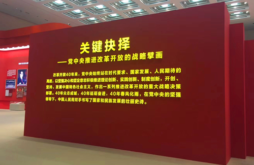 展览以坚持和发展中国特色社会主义为主题,紧扣改革开放40年历程,设计了伟大的变革、壮美篇章、关键抉择、历史巨变、大国气象、面向未来六个主题内容展区。展区内党的十一届三中全会等反映党中央推进改革开放重大时间节点、重大历史事件、重大决策部署的历史照片,拉开中国农村改革大幕的安徽小岗村18位农民按下包产到户“红手印”的雕塑,长征系列运载火箭、天宫号空间站等逼真的实物模型、详实的图片图表、丰富的视频资料等内容多角度、全景式的展现了40年来经济建设、政治建设、文化建设、社会建设、生态文明建设历史性成就与变革,展示了改革开放的光辉历程、伟大成就、宝贵经验等。